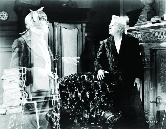 Illustration from 1843 first edition. Film still above is from the 1938 movie with Reginald Owen as Scrooge and Leo G. Carroll as Marley